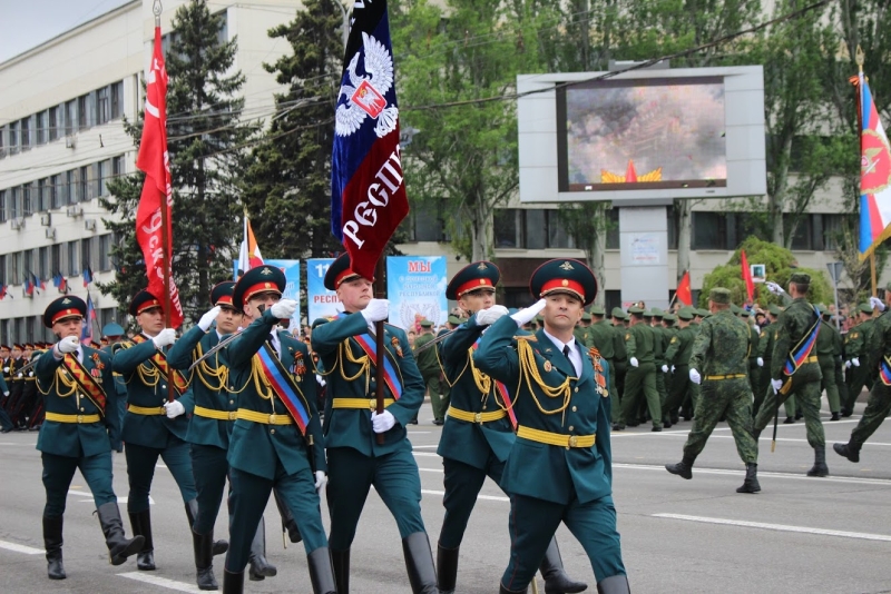 En la calle principal de Donetsk, la guardia de honor desfila con la bandera de la República Popular de Donetsk. Le sigue la bandera de la victoria.