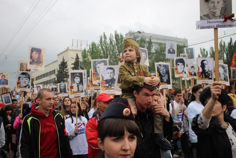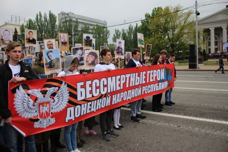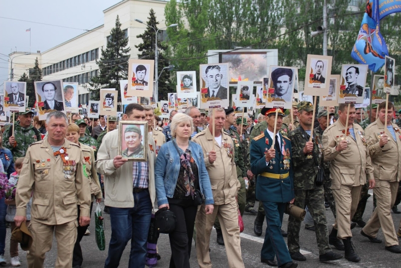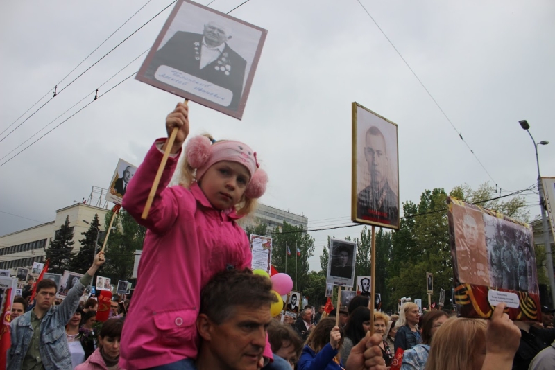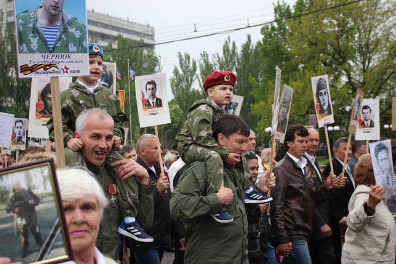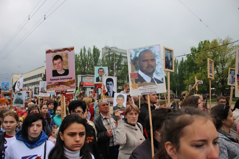 Les sigue el Regimiento Inmortal. Sus filas están compuestas por familiares de quienes defendieron su tierra en la Gran Guerra Patria y los de quienes han muerto recientemente defendiendo su tierra de Donbass de los radicales ucranianos. Los hijos y nietos de veteranos de guerra y madres, esposas e hijos de quienes han participado en la guerra de Donbass. Muchas lágrimas. Comienza a llover, parece que, igual que los familiares y amigos, la naturaleza también llora a los muertos.