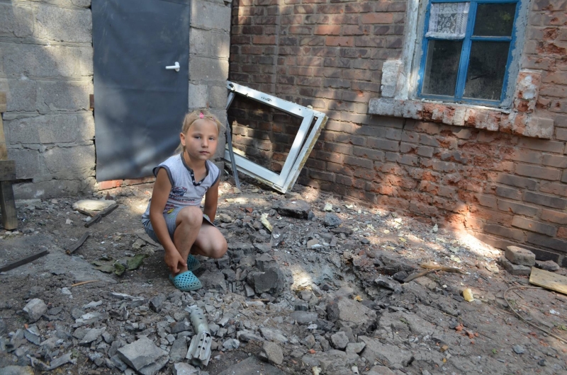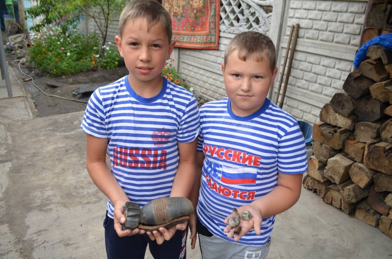 A finales de julio, junto al voluntario de Donetsk Andrey Lysenko, visitamos esas calles de Trudovsky que a diario aparecen en los listados de daños. Nos sorprendió la cantidad de niños que residen allí: desde bebés recién nacidos a casi adultos de instituto. Durante los días de verano, estos niños se acuestan y se levantan entre el sonido de las explosiones, periódicamente se ven obligados a refugiarse en los sótanos y cuentan los minutos entre los ataques para poder salir a la calle a andar en bicicleta. Y cada mañana, como hábito, recogen de los jardines los restos de metralla. Temen el otoño por las predicciones que escuchan en las conversaciones de sus padres sobre el frente.