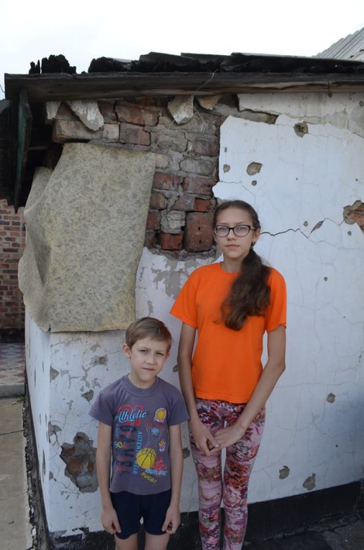 Estos adorables hermanos viven en la misma calle, Tomskaya. Dos proyectiles impactaron directamente en el tejado, uno más en la pared. Han pasado casi todo julio en el sótano.