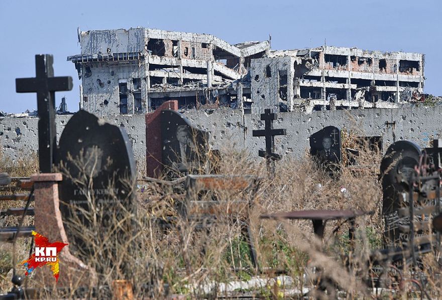 No hay una sola tumba que no haya sufrido daño. Las balas en las tumbas con el esqueleto del aeropuerto de fondo: es una escena aterradora. El destruido monasterio completa la imagen. El cementerio está limpio, pero el peligro aún acecha. En todas partes hay restos de proyectiles.