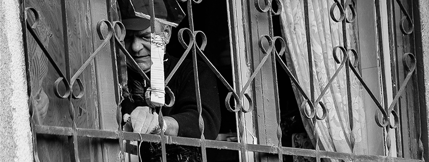 Se escucha el sonido de los cristales rotos. Los vecinos se ayudan unos a otros a reparar los fragmentos rotos y a recoger los restos de las ventanas. Protegen las ventanas con tela. Algunos han conseguido encontrar láminas de madera. Cerca de la entrada, encontramos un gran cráter que ha dejado un proyectil.