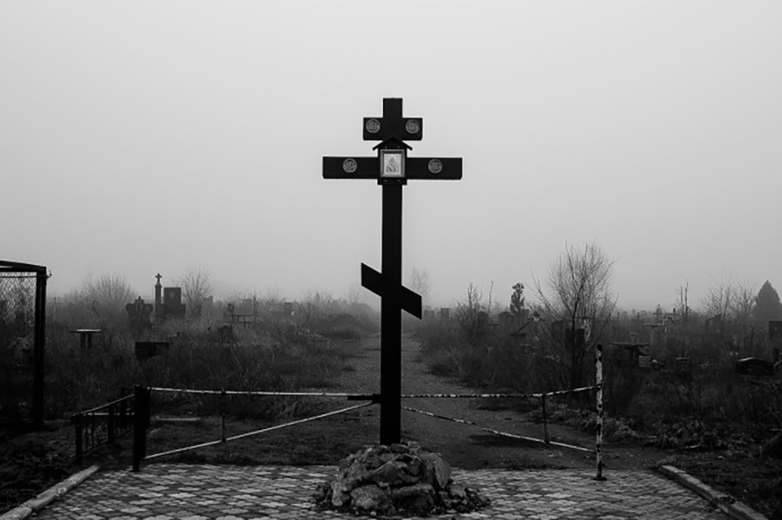 Al pasar por el cementerio de Novoignatevskiy, destruido por las acciones de combate, nos fijamos en una tumba reciente. Eso sorprendió a todos, ya que es difícil imaginar que haya sido posible enterrar a alguien en este lugar tan cercano al aeropuerto de Donetsk en estos momentos. Pero más adelante conocemos a los hombres que nos explican que, efectivamente, siguen realizando entierros. Intentan aprovechar los momentos de tranquilidad cuando las armas callan. No siempre es posible. Justo en ese momento, la batalla se reanuda en Peski.