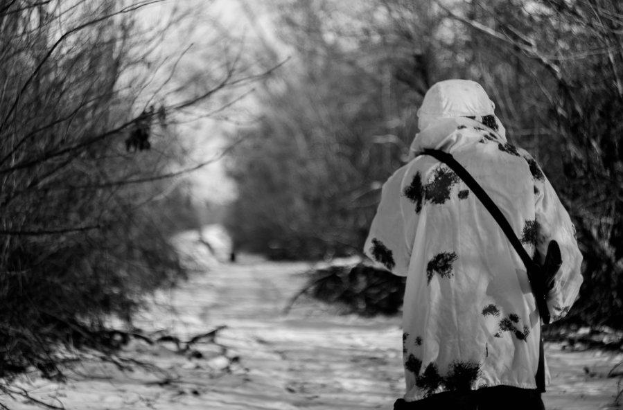 Paramos en el lugar en el que habitualmente nos colocamos el equipamiento de protección. Sacamos del maletero los casos y chalecos antibalas. Un minuto más tarde, ya vestimos la protección. Pero llamamos la atención. Entre la nieve de las trincheras, somos objetivos demasiado fáciles para los francotiradores ucranianos. Por eso, los militares amablemente intentan que nos camuflemos. Inmediatamente empiezan a preocuparnos los francotiradores. Nos encontramos muy cerca de uno de ellos. Llega rápido, un disparo. El sonido retumba en la pared de las casas. Viene de algún lugar cercano. Teníamos que movernos rápidamente hacia allí, donde venía el disparo.