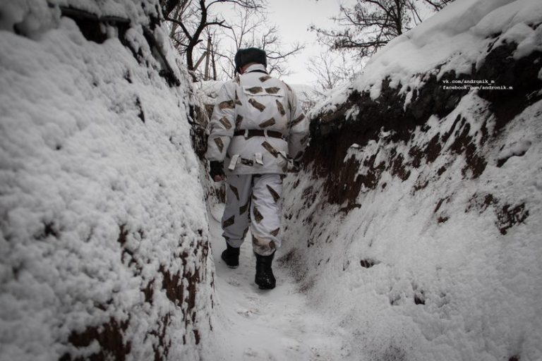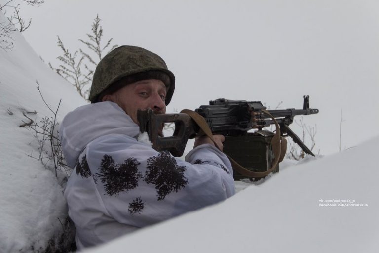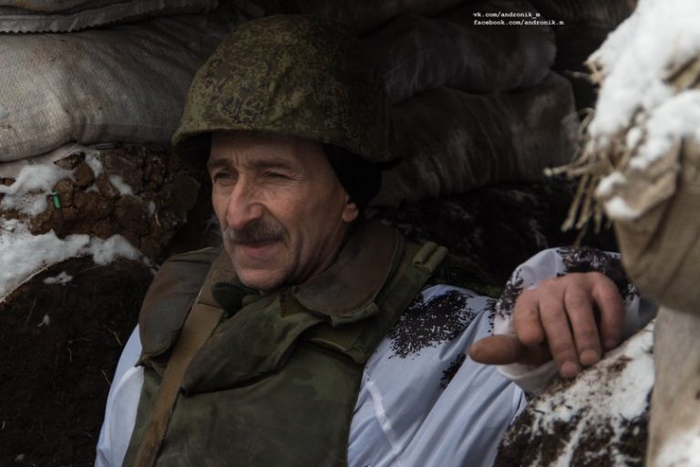 Shmel es un hombre con bigote, ya no muy joven y que defendió a su familia en Gorlovka desde el principio de la guerra. Nos cuenta que tras el anuncio de la llamada tregua de Año Nuevo, los bombardeos se redujeron, pero ahora gradualmente vuelven a la normalidad. Además de eso, el enemigo se refuerza con más equipamiento pesado: desde las posiciones en Zaitsevo se pueden oír perfectamente los convoyes que llegan desde Mayorsk.