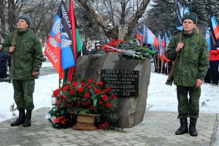 Los participantes guardaron un minuto de silencio en memoria de los civiles y soldados de la República que murieron en la batalla e inauguraron un memorial “a nuestros hermanos y hermanas caídos a manos de las tropas ucranianas, 2014-2015”.