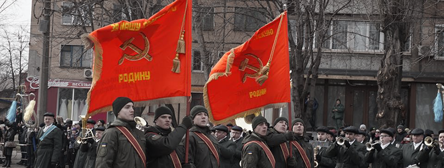 El 22 de febrero, en Krivoy Rog, región de Dnipropetrovsk, miembros de la Guardia Nacional de Ucrania que participaron en los actos conmemorativos del 74º aniversario de la liberación de la ciudad de los invasores alemanes marcharon portando símbolos soviéticos: la bandera roja de combate de la Segunda Guerra Mundial. Además del símbolo de la Unión Soviética, la hoz y el martillo, las banderas estaban adornadas también con la inscripción “Por nuestra patria soviética”.