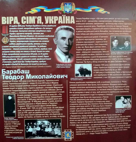 La participación de Vovk no es el único vínculo del acto con España. En realidad, la exposición está principalmente dedicada a uno de los miembros destacados de la Galizien Division, Theodor Barabash, que pasó la mayor parte de su vida en Madrid. El panel expositor habla de la vida de este veterano, nacido en la localidad, su participación en la guerra, el cautiverio, y su posterior vida en España, país al que llegó en 1946. Como sus acompañantes, procedía del campo de concentración británico de Rimini, destinado a prisioneros de guerra aliados de la Alemania nazi.