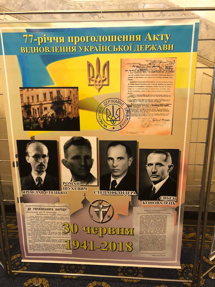 Cartel conmemorativo del aniversario del Acta de Independencia de Ucrani, con la imagen de Stetsko, Shujievich, Bandera y Konovalets colocada esta semana en el Parlamento de Ucrania