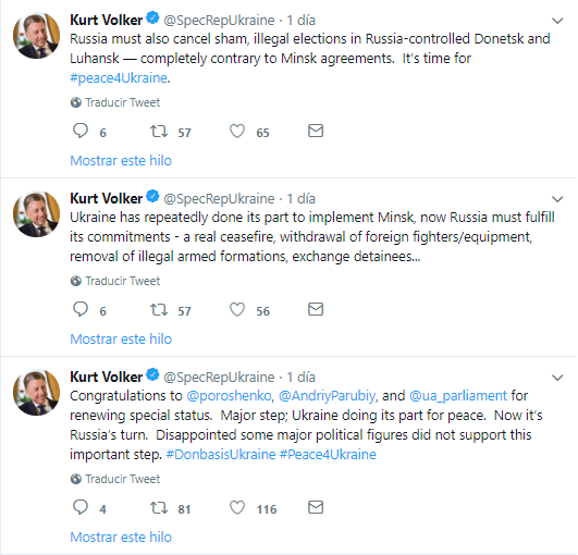 “Felicidades a Petro Poroshenko, Andriy Parubiy y el Parlamento de Ucrania por la renovación del estatus especial. Un paso importante; Ucrania hace su parte en busca de la paz. Ahora es el turno de Rusia. Decepcionado porque algunas figuras políticas importantes no han apoyado este importante paso”, afirmó Volker (en inglés y en ucraniano) en aparente referencia a Yulia Timoshenko y su proamericana facción Samopomisch.