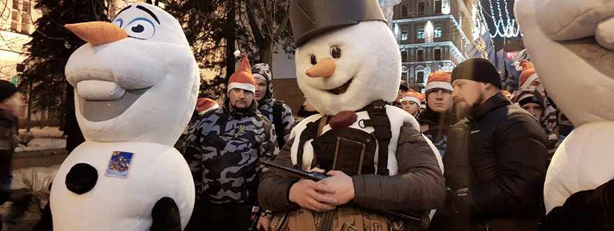 Varios elementos diferenciaron las dos marchas. Si los partidarios de Svoboda decidieron no cambiar las tradiciones y marcharon bajo las antorchas, los defensores de Biletsky optaron por gorros de Santa Claus y delante de ellos, los organizadores habían colocado a animadores vestidos de muñeco de nieve. Parece una especie de burla del Corpus Nacional a sí mismos y sus oponentes en la marcha de antorchas rival. Ya en movimiento, los participantes entonaron los cánticos habituales: “Gloria a Ucrania. Gloria a los héroes”, “Bandera, Shujevich – nuestros héroes. Lucharon por nosotros y por vosotros”, etc. Finalmente, las dos columnas llegaron a la plaza de la Independencia, donde se celebró un acto.