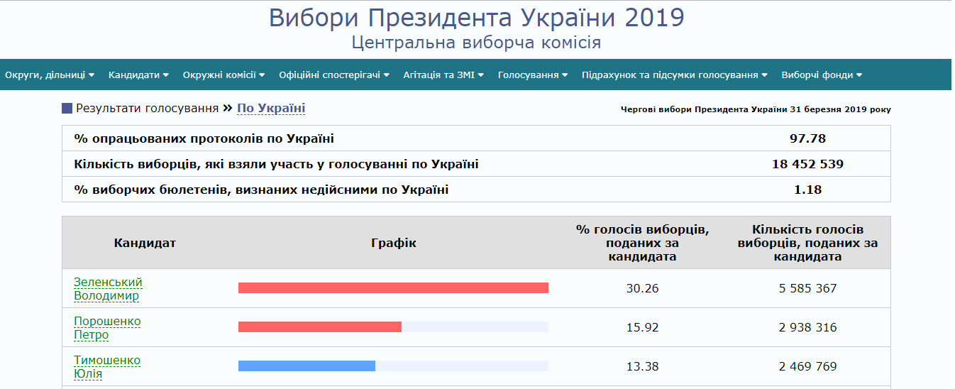 Tras el recuento del 91% de los votos en Ucrania [ahora, con el 97% escrutado, la situación es exactamente la misma], Zelensky, que ha conseguido más votos que la suma de los obtenidos por Poroshenko y Timoshenko, lidera por un amplio margen. La distancia entre Poroshenko y Timoshenko se ha reducido a alrededor del 2,5% pero es improbable que vaya a desaparecer completamente. Sin embargo, el escaso margen entre ellos deja a Timoshenko pocos argumentos para alegar fraude electoral. Hay que destacar que el falso candidato Timoshenko Yu. V. [Yury V. Timoshenko en lugar de Yulia V. Timoshenko, que comparten iniciales al abreviar el nombre y de ahí la más que posible confusión a la hora de votar-Ed] ha conseguido más de 100.000 votos que ha restado a la verdadera candidata Timoshenko.