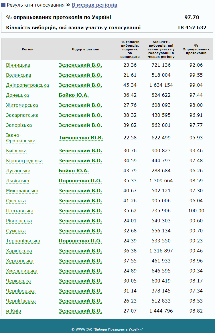 Ganadores por región: Timoshenko se lleva solo Ivano-Frankivsk; Poroshenko Lviv y Ternopil y Boyko, Donetsk y Lugansk. Zelensky gana en todas las demás regiones.