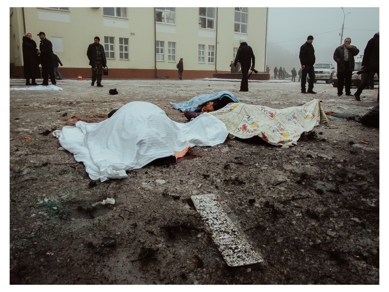 Víctimas del ataque contra la Casa de Cultura Kubishev. Gran parte de las víctimas de aquel día eran pensionistas que esperaban en la cola para recibir ayuda humanitaria. Se entregaba en la Casa de Cultura. Donetsk, 30 de enero de 2015.