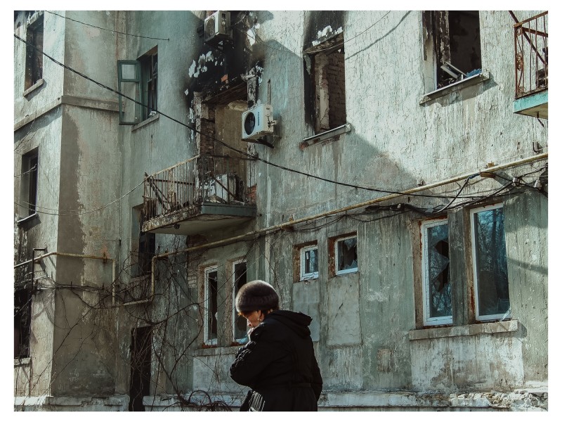 Una residente de la localidad de Uglegorsk vuelve al destruido edificio en el que había vivido hasta que estalló la guerra. El edificio sufrió daños durante la batalla. El Famoso edificio del número 24 de la calle Nekrasov se ha convertido en una especie de símbolo de la batalla por la ciudad. Uglegorsk, 11 de marzo de 2015.