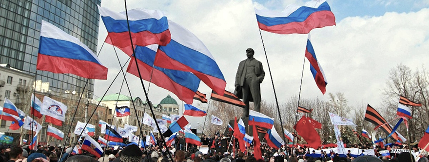 Banderas rusas, soviéticas y de la RPD en Donetsk durante las protestas de marzo de 2014 que finalmente dieron lugar a la proclamación de la RPD.