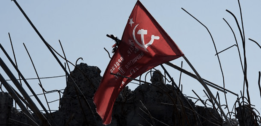 Bandera de la victoria en Donbass, donde, al contrario que en Ucrania, no se censura la hoz y el martillo ni se esconde en las celebraciones