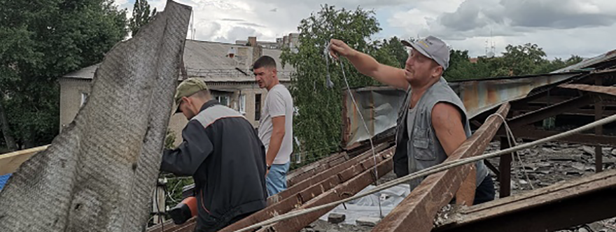 Operarios reparan el tejado de la residencia de ancianos de Yasinovataya, alcanzado por un proyectil la semana pasada