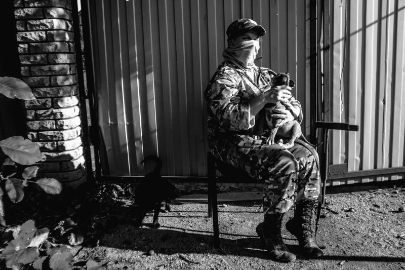 En el pueblo hay muchos animales abandonados. Sus dueños se marcharon, pero sus pequeños guardianes se mantuvieron leales a sus hogares. Los militares cuidan de los gatos y perros, les dan de comer. “Suele pasar que los gatos y perros sufran heridas de metralla. Si hay un ataque con mortero, una vaca puede sufrir lesiones. No solo los humanos”, sonríe la chica a través de la balaclava con la que esconde su cara.