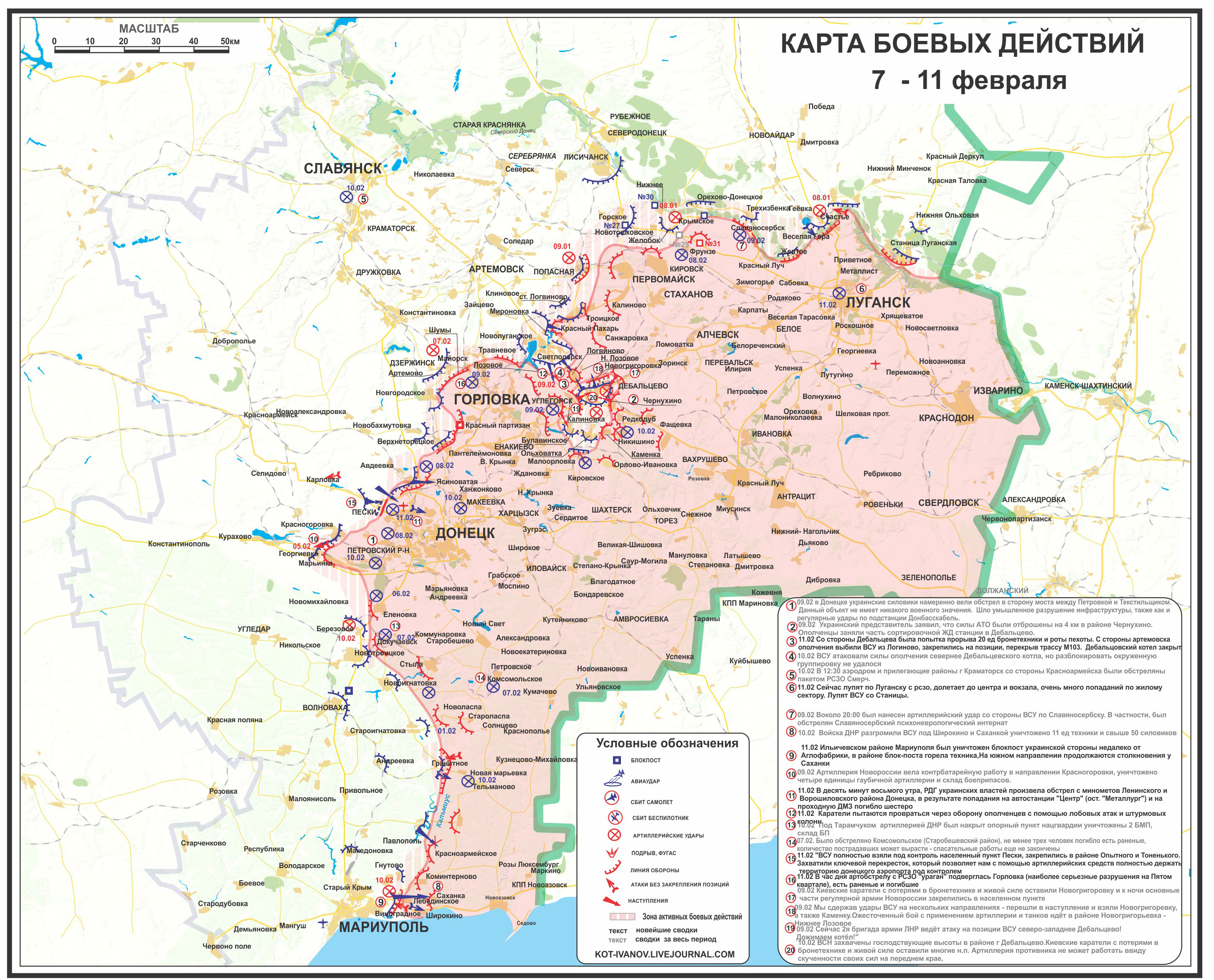 Mapa de la situación entre el 7-11 de febrero de 2015 en el que se puede apreciar que, entre toda la zona dominada por la RPD y la RPL, Debaltsevo se enontraba rodeado, aún bajo control ucraniano.