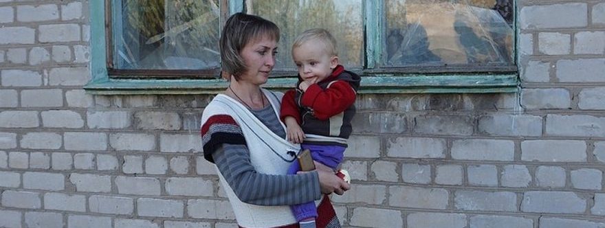 Se nos acerca una mujer rubia con un bebé en brazos. “No tenemos dónde ir. Tengo dos hijos. Nuestra casa está destruida, así que alquilo un piso. No hay guardería aquí y el colegio está en Dokuchaevsk. Mi hija va allí cada mañana. Recibo 1720 rublos por el más pequeño y 1500 más por ser madre sola. Esos son todos nuestros ingresos”, explica Tatiana. “En el pueblo solo hay un quiosco, que no siempre tiene pan para comprar. Más de una vez me he encontrado bajo las bombas. A veces llevo a los niños, así que intento no alejarme de las casas. Una vez dispararon a pleno sol. Cogí al niño y conseguí llegar al sótano mientras volaba la metralla. Una bomba impactó en casa del vecino. Desde entonces, Vanya está muy nervioso, llora mucho por las noches cuando hay ruido.