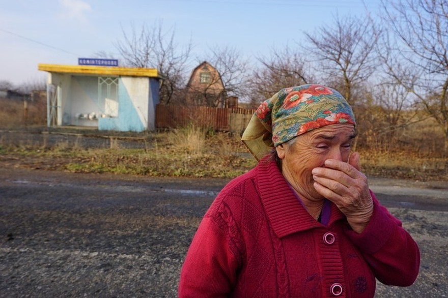 “¡Que cómo vivimos!”, contesta una mujer. “Somos un Segundo Jatin. ¡Mire! Antes había varias tiendas, un club, un colegio, guardería. Ahora no hay nada. Las calles están quemadas. La tienda ha sufrido daños tres veces, pero sigue trabajando. Al menos podemos comprar pan. Pero no hay farmacias ni hospitales. Si necesitamos algo, vienen de Bezimenoe, a 12km. Y tenemos a mucha gente encamada, personas mayores indefensas”.
