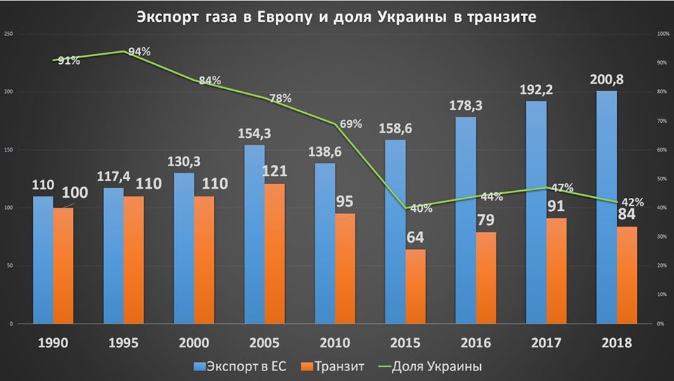 El gráfico ilustra también el progreso de Rusia. A finales de 2019, el 40% de las exportaciones de gas ruso a la Unión Europea pasan por Ucrania. Teniendo en cuenta el reciente acuerdo, el volumen caerá al 30% en 2020 y al 25% en un año. La necesidad real de las tuberías ucranianas no superará, cuando se completen el Turkish Stream y en Nord Stream-2, el 10%.