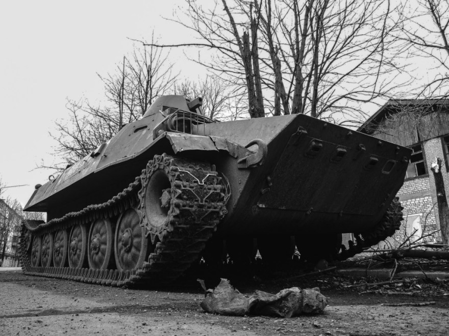 Pasar por aquí sigue siendo peligroso. Nos han avisado de ello de antemano, hay que tener cuidado con dónde pisamos. Los ingenieros ya han empezado a trabajar en la ciudad, pero solo es completamente segura la plaza central. En los patios cercanos a la estación y en esa zona de la ciudad aún hay minas, el mortal legado del Ejército Ucraniano.