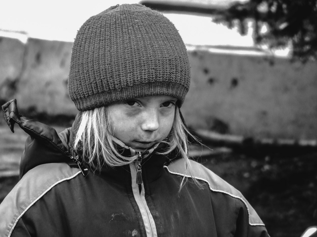 Los niños me llaman la atención inmediatamente. Son especiales. No son como los niños que acostumbramos a ver. Incluso los niños de los hostales para refugiados son diferentes. Estos niños ya no son niños. Entre ellos hay una niña. Su nombre es Nastia. No es el tamaño de su gran abrigo con capucha azul, sus pantalones negros con agujeros ni su envejecido gorro rojo, del que salen algunos rizos rubios. En las manos y en la cara de la niña había barro. Mi lente está mirándola en el momento en que mi dedo pulsa el botón para captar su penetrante mirada. Es una mirada dura y exhausta. Parece que ya no le importa nada en el mundo.