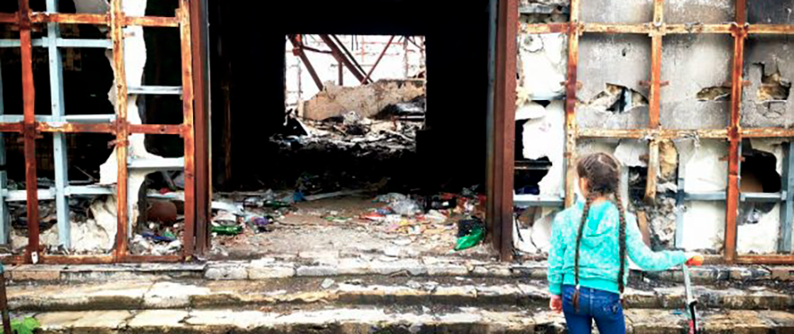 Camino con Olga y su hija de ocho años por el pueblo, donde no hay un solo edificio intacto. Las tiendas han sufrido daños por los impactos directos. Los dueños no ven la necesidad de retirar el contrachapado o de reparar los daños hasta que acabe la guerra, ya que los edificios pueden ser destruidos en cualquier momento otra vez. Solo hay pequeñas tiendas y el mercado.
