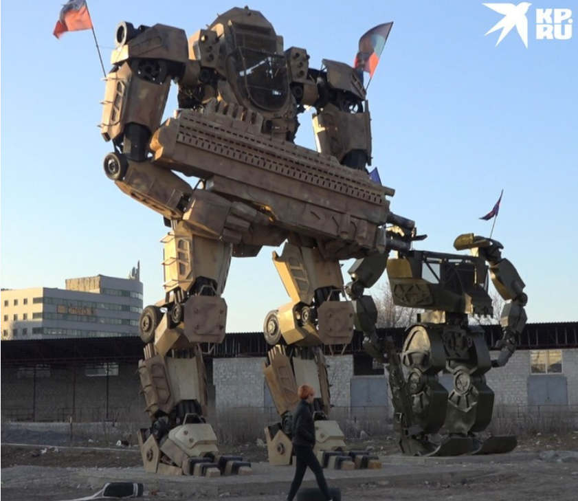 Después de la competición, me acercan a un interesante objeto artístico que ha aparecido recientemente en Donetsk: un enorme robot en forma de transformer que anda como un humano. Lo han hecho en su tiempo libre los trabajadores de un taller de reparación de coches. El robot más grande, que tiene una bandera de la RPD y la de la Federación Rusa, pesa cuatro toneladas y mide trece metros. En la conciencia colectiva de Donetsk, estos robots son una especie de defensores de Donbass, una proyección de las expectativas y aspiraciones. Dicen que, si pasa algo, los gigantes de acero saldrán de los grises bosques en los que vive el ejército escondido de Donbass y volverán hasta acabar con los banderistas en sus bunkers de las colinas de los Cárpatos.