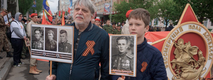 Cada año crece la columna del regimiento inmortal de los héroes de nuestra guerra, este año es casi tan grande como la columna con retratos de los héroes de la Gran Guerra Patria. Muchas personas portan, junto a los retratos de los caídos de la milicia, retratos del primer presidente de la RPD, Alexander Zajarchenko. Una mujer lleva iconos en las manos junto a un cartel con las imágenes de milicianos caídos.
