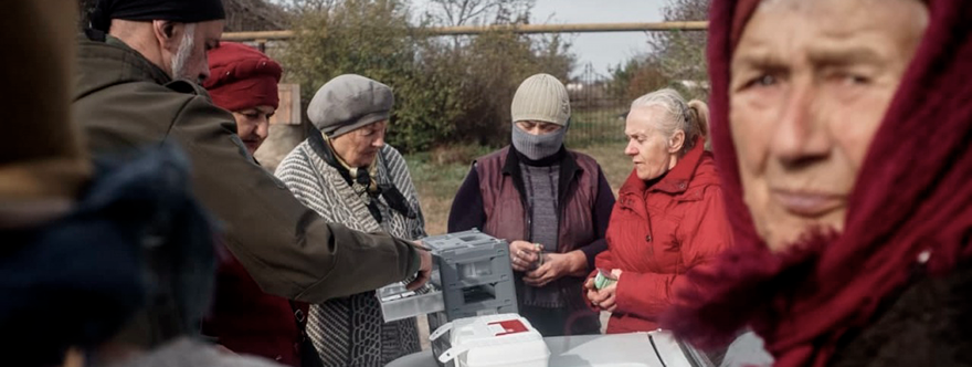 Liubov Ivanovna va llamando a los habitantes de estas casas en ruinas. Poco a poco, los residentes se reúnen cerca del Zhiguli blanco de la trabajadora social. Los voluntarios empiezan a sacar las cajas de medicinas y las van distribuyendo.