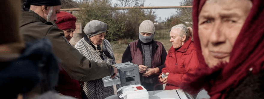 Unas 70 personas siguen viviendo en Kominternovo, fundamentalmente personas mayores. No hay farmacia ni servicios médicos en la localidad. Les salva la trabajadora social Liubov Ivanovna. Es quien lleva a las personas mayores las medicinas que necesitan y todo lo que piden los residentes. Lleva un llamativo abrigo rojo. Nos recibe en la única tienda del pueblo. Las ventanas están contrachapadas y hay marcas de proyectiles en las paredes. Liubov Ivanovna llega en un modesto Lada Zhiguli que aparca junto a la tienda. La trabajadora social vive en los márgenes del pueblo. Nos advierte de no ir allí, es peligroso.