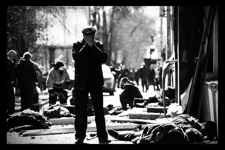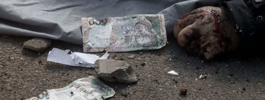 Comencé a acercarme observando los detalles. En algún lugar había un cuerpo sin cabeza bañado en sangre, en otro restos de cráneo y en otros, restos de billetes. No eran billetes como los que acostumbro a ver. Me di cuenta de que eran grivnas ucranianas. Billetes de 500 grivnas estaban desperdigados a la entrada del banco. Parece que estas personas mayores querían cambiarlas por rublos. Puede que fueran sus pensiones, esas que una vez fueron a recoger a territorio ucraniano. Eso les obligaba a pasar horas en las colas antes de poder cruzar la línea del frente. Algunas personas no pudieron aguantarlo y murieron en las propias colas. Kiev creó tantas barreras que los mayores de Donbass dejaron de ir a por su dinero. Así que ahora Kiev ha bombardeado a esas personas solo porque el Ejército Ucraniano está fracasando en todos los frentes.