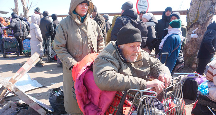 Observo a un hombre sentado con una carretilla. En ella hay una pila de mantas bajo las que yace una mujer pálida con los ojos cerrados. Así es como este marido ha sacado a su esposa, enferma de cáncer, de Mariupol. Aquí, los sanitarios ponen a la mujer una inyección de calmantes y llaman a un coche que la lleve al hospital.