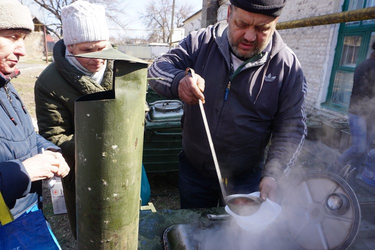 La segunda sorpresa es que hay voluntarios del ejército, rescatistas y psicólogos vistiendo idénticos chalecos y con distintivos en el pecho. En mi primer viaje, no había nada de eso salvo los militares del puesto de control y los refugiados. Esta vez, ya se ha desplegado una cocina de campaña en la que se alimenta a la población con estofado, té y galletas. Hay algunas señales de “Punto de evacuación” o “Registro de refugiados”. Incluso se puede ver a Cruz Roja.
