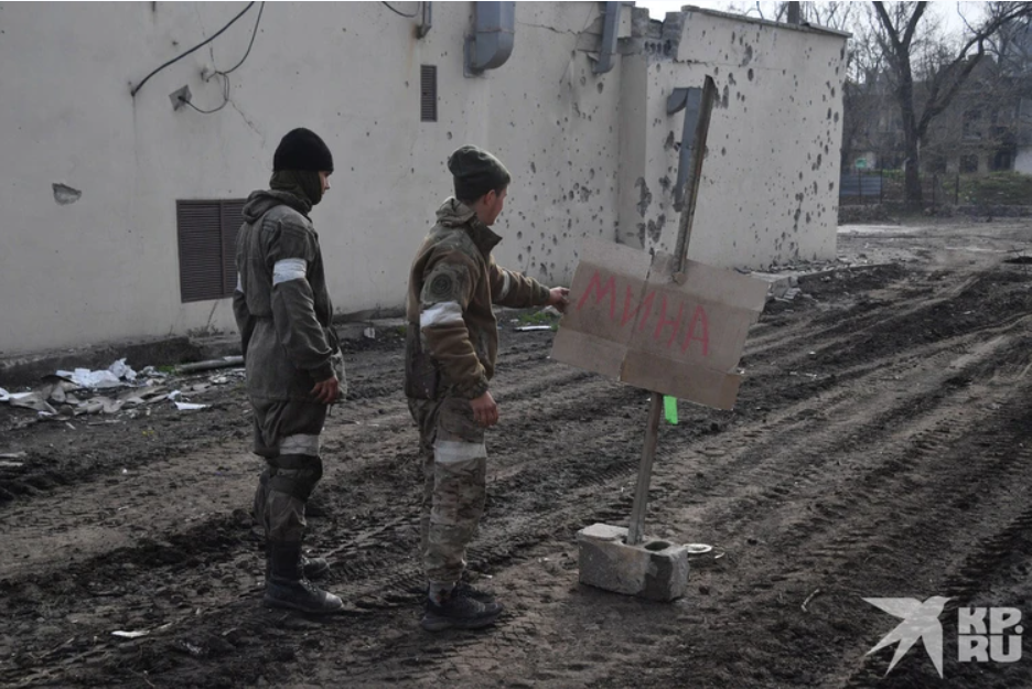 A la vuelta, entre las muchas filas y filas de vehículos blindados, mi compañero periodista Philip Prokudin ha encontrado una mina. Sobresalía del asfalto tranquilamente. Es probable que las lluvias hayan removido la tierra y movido esta mina antitanque. Es algo peligroso e inmediatamente informamos a los militares. Rápidamente escriben la palabra “Mina” en un trozo de cartón, lo acoplan a un palo grande y lo colocan en el lugar. Los zapadores tienen mucho trabajo por hacer. En cuanto estén libres, podrán lidiar con la mina.
