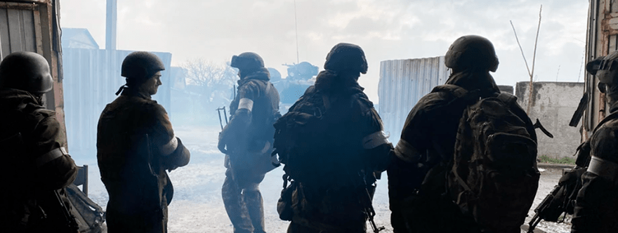 El único lugar seguro en este edificio es un pasillo de veinte metros que no tiene ni puertas ni ventanas. Todo el personal del grupo de asalto se reúne aquí para todo menos para disparar. Corremos por las puertas agachados, pero el otro lado el edificio ya está en la retaguardia. Se ha colocado una cocina de campaña ahí: se están calentando raciones de carne en lata. Está lleno de marcos, polvo en el suelo, ventanas rotas y puertas destrozadas. Llego a tiempo para la segunda fase de la operación: el barrido final. Nuestro comandante, el sonriente soldado de nombre de guerra Les [bosque] nos cuenta dónde nos hemos metido: “el enemigo está a 600 metros a nuestra izquierda. En teoría, puede disparar a través del pasillo, ¿pero para qué haría eso a estas alturas?”. Las palabras de Les no necesitan explicación. A juzgar por las constantes voleas de howitzers, el enemigo a nuestra izquierda no tiene con qué contrarrestar. Pero a lo largo de la fachada de nuestro edificio, el enemigo está a 200 metros. Los grupos de asalto trabajan allí, nuestra tarea es no dejar que el enemigo escape de ahí.