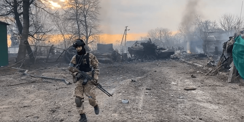 El vídeo recoge el ataque de un tanque camuflado que tiene a vista a la columna rusa de blindados e infantería en retirada y dispara contra ella, además de contra otras posiciones de las fuerzas rusas, mientras la artillería ucraniana ataca en paralelo contras otras posiciones y equipos. En el vídeo puede observarse la destrucción de varios BTR-82A, alguno de ellos en llamas, con la tripulación tendida en el suelo.
