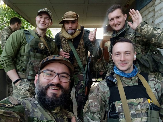 El grupo de Horovets (en la fila de abajo, primero a la derecha) en el área de Izium en mayo de 2022.