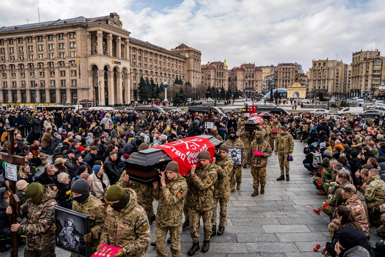 Los ataúdes fueron llevados a la simbólica plaza con honores, portados a hombros por miembros del ejército de Ucrania, aunque cubiertos únicamente por la bandera del grupo nacionalista y fundamentalista ortodoxo. Siguiendo algún tipo de protocolo que parecía querer dejar claro qué correspondía a cada parte, la única bandera de Ucrania presente en el cortejo, la que lo presidía, también venía portada por soldados ajenos a Bratstvo. Los combatientes de la unidad se limitaban a llevar los retratos de sus compañeros muertos. La bandera de las Fuerzas Armadas de Ucrania que había formado parte del acto de entrada al funeral en San Miguel no apareció en el acto de Maidán.