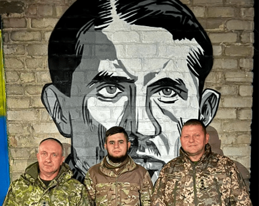 Kotsyubailo, junto a Zaluzhnyi, posando al lado de un mural de Yevhen Konovalets, fundador de la OUN