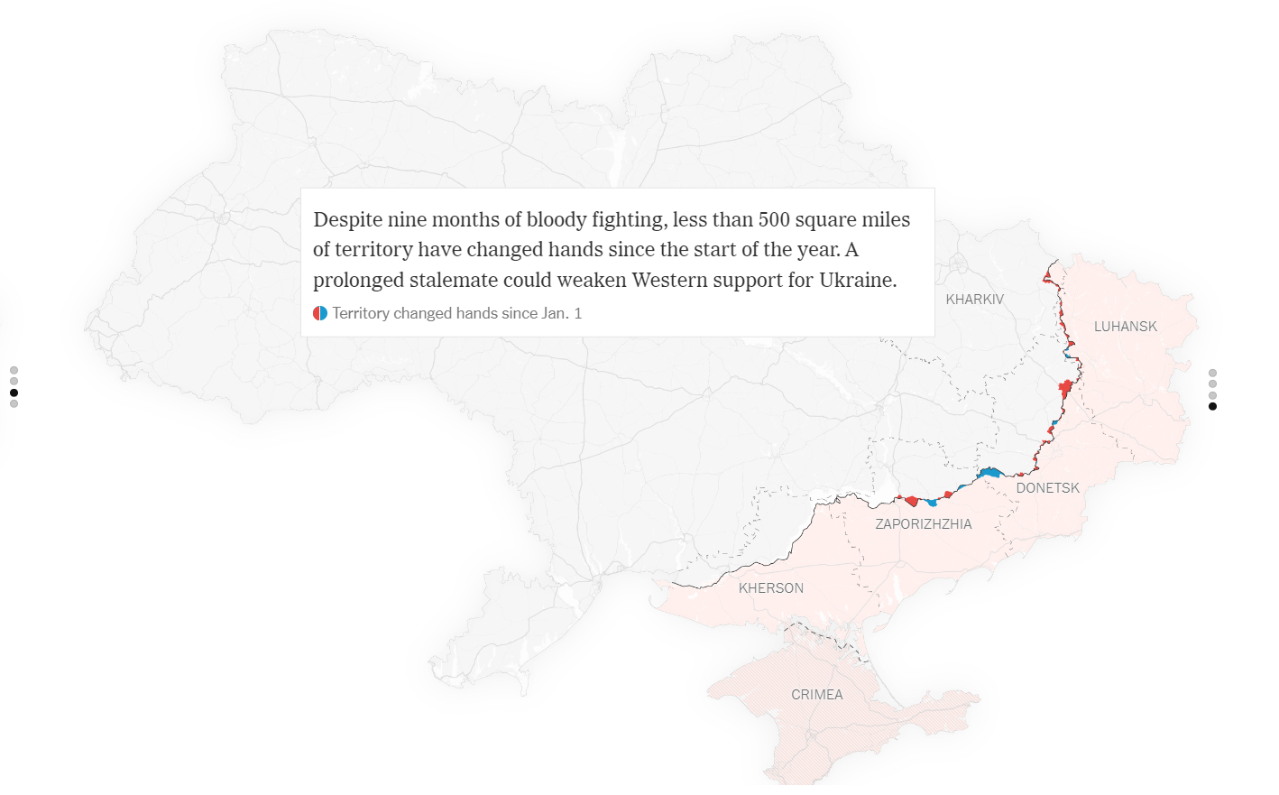 “Pese a nueve meses de sangrienta batalla, menos de 500 millas cuadradas de territorio han cambiado de manos desde el comienzo del año”, afirma el artículo, que en un gráfico posterior muestra 143 ganadas por Ucrania y 331 por Rusia. El bagaje es pobre especialmente teniendo en cuenta las expectativas, especialmente para Ucrania. Y es que cada mención a acciones ofensivas rusas que se ha comentado a lo largo del último año ha sido refutada por el tiempo. Puede acharcarse esa ausencia de ofensivas a carencia de potencial o, como parece sugerir The New York Times, a la táctica utilizada. “Toda la estrategia en Ucrania se basa para los rusos en dejar que los ucranianos choquen contra esas defensas, matar al máximo posible y destruir todo el equipamiento occidental posible”, afirma el medio citando a Marina Miron, experta del King’s College London, que añade también que Rusia espera al desgaste occidental. A estas alturas, todas las partes son conscientes de que la repetición del suministro en enormes cantidades que se ha producido este año va a ser imposible para gran parte de los países que han colaborado.