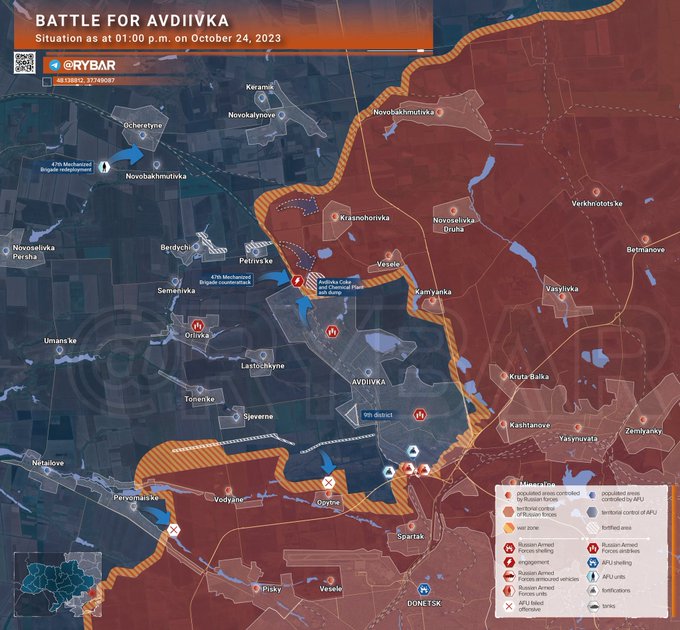 Los avances rusos alrededor de Avdeevka han sido, durante días, muy escasos y aunque no hay datos disponibles de bajas, la naturaleza de la batalla hace pensar que han tenido que ser elevadas. Uno de los puntos importantes por los que las partes han luchado, y siguen luchando, activamente es el vertedero de ceniza, una colina alargada que marca la orografía y que es, con su algo más de 200 metros, la altura dominante. El control de ese punto supone una posición de fuerza para tratar de avanzar hacia la zona de la estación de tren, objetivo ruso desde el inicio de la maniobra. Las fuentes rusas se refieren al área ferroviaria como lugar por el que Rusia comenzó a luchar el 10 de otubre y mencionan el control ucraniano sobre la colina como principal motivo por el que el avance no fue posible. Durante varios días, la ofensiva local hacia Avdeevka ha sido puesta en cuestión no solo por fuentes ucranianas, que la han utilizado para minimizar su fracaso en el intento de avance desde Rabotino, sino también por algunas fuentes rusas que, desde el realismo más pesimista, han llegado a ver la repetición de lo ocurrido en Ugledar. En ese caso, con la necesidad de avanzar sobre la ciudad, situada en altura, a través de un campo abierto, las tropas rusas sufrieron grandes bajas en sus varios intentos fallidos de acercarse a la ciudad y abandonarlos finalmente.