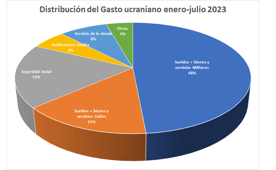 Ese último dato, aunque ignorado desde el 24 de febrero de 2022, es un importante condicionante para Ucrania que, pese a la retórica de defensa de la independencia, es cada vez más dependiente de actores externos. Una parte de las ayudas financieras y económicas que actualmente recibe Kiev llegan al país a fondo perdido, subsidios por los que los aliados de Ucrania no exigirán retorno. Sin embargo, otra parte de la asistencia pasará, a medio plazo, a engrosar una deuda ya excesiva a la que Kiev tendrá que hacer frente de alguna manera. Los datos ofrecidos por el Ministerio de Finanzas de Ucrania dejan poco lugar a dudas sobre la importancia de estas deudas. Según las cifras oficiales del desglose del gasto en los primeros siete meses del año, y a pesar de esa parte de asistencia sin espera de contrapartida o de pagos a muy largo plazo, el 8% del gasto de Ucrania entre enero y julio de 2023 se destinó al servicio de la deuda.