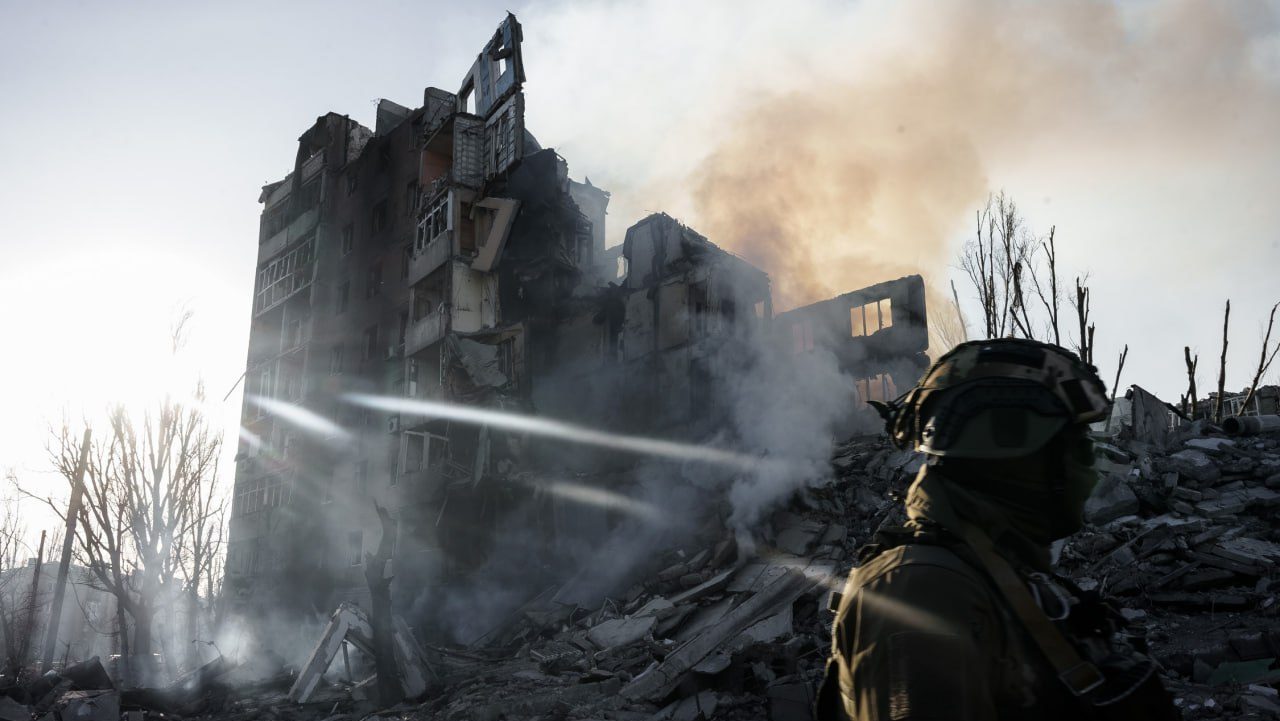 Kazbek aparcó el Lada Niva junto a uno de los edificios de apartamentos. Parecía de los menos dañados de la zona. Un bloque de ladrillo de cuatro pisos ardía junto a él. A consecuencia de ello, parte de Avdeevka estaba cubierta de humo pese a los rayos del sol de marzo. Me apresuré al origen de las nubes negras. Dudé un poco mientras filmaba los restos del edificio de nueve pisos. Los soldados tuvieron que recordarme que no se puede estar mucho tiempo en un mismo lugar. “Entiendo que nunca vas a tener suficiente material, pero nos tenemos que ir”, dijo Kazbek con cierta condescendencia. “¿Hay mucha población civil en la ciudad?”, pregunté aprovechando la ocasión. “Suficiente”.
