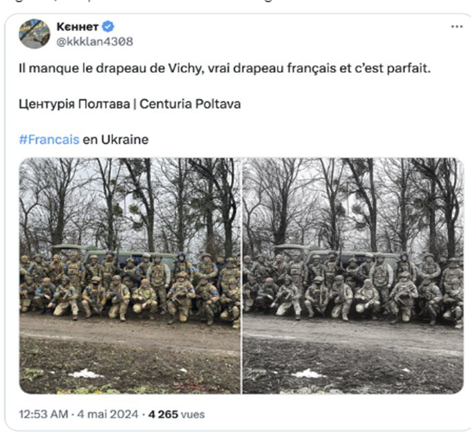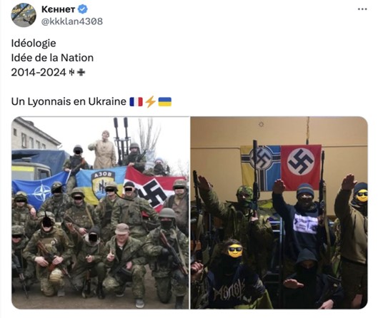 En un tuit del 19 de junio de 2024, Kenneth hacía gala de la conexión neonazi ucraniano-francesa, mostrando algunas de las simbologías unificadoras, entre ellas el wolfsangel que enlaza al movimiento Azov con el pasado de unidades del ejército nazi, Das Reich, conocida por sus acciones bárbaras en ciudades francesas, entre ellas la de Tulle en el sur de Francia.
