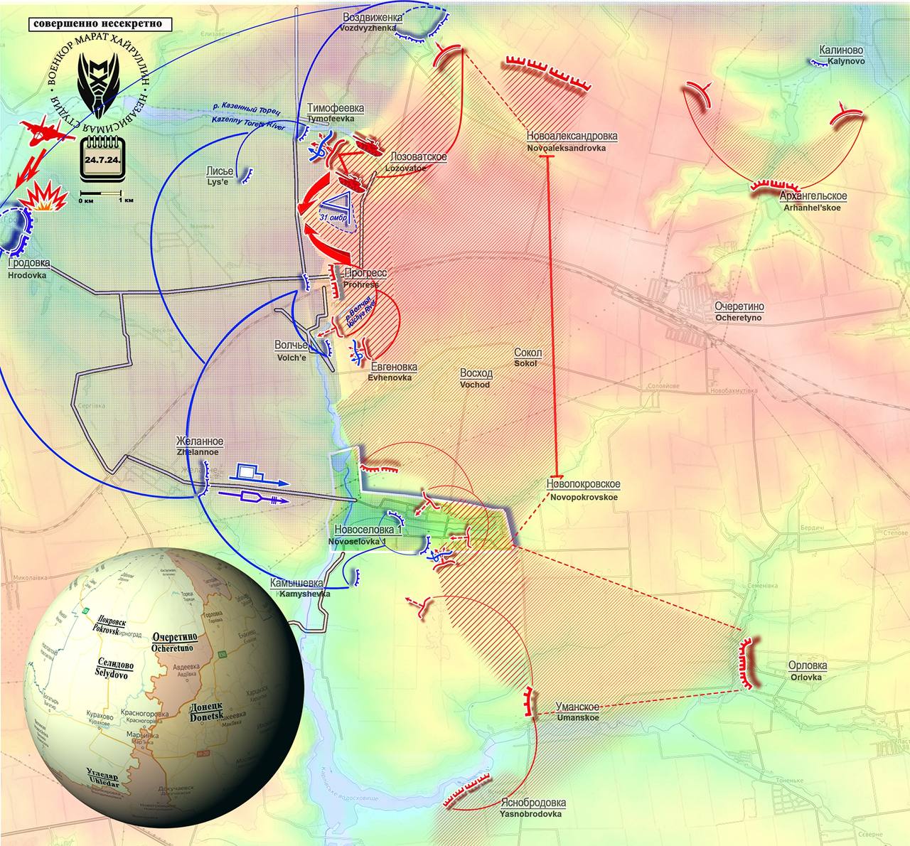 Krasnoarmeisk, centro logístico de la zona, es clave como nudo de comunicaciones. Es ahí donde se encuentra centralizado el mando ucraniano que controla este sector clave de la parte occidental de Donetsk, que enlaza con el frente de Zaporozhie, en el que Ucrania sigue teniendo aspiraciones de avance sobre Crimea. Aunque las tropas rusas se encuentran aún a unos 30 kilómetros, la situación es lo suficientemente comprometida para las Fuerzas Armadas de Ucrania como para que haya trascendido en medios extranjeros y sea admitida por fuentes como DeepState. La pasada semana, y de forma algo más sencilla que en batallas anteriores, las tropas rusas capturaron la localidad de Progres, tras lo que continuaron el asalto de las trincheras al norte de la localidad y prepararon posteriores avances.