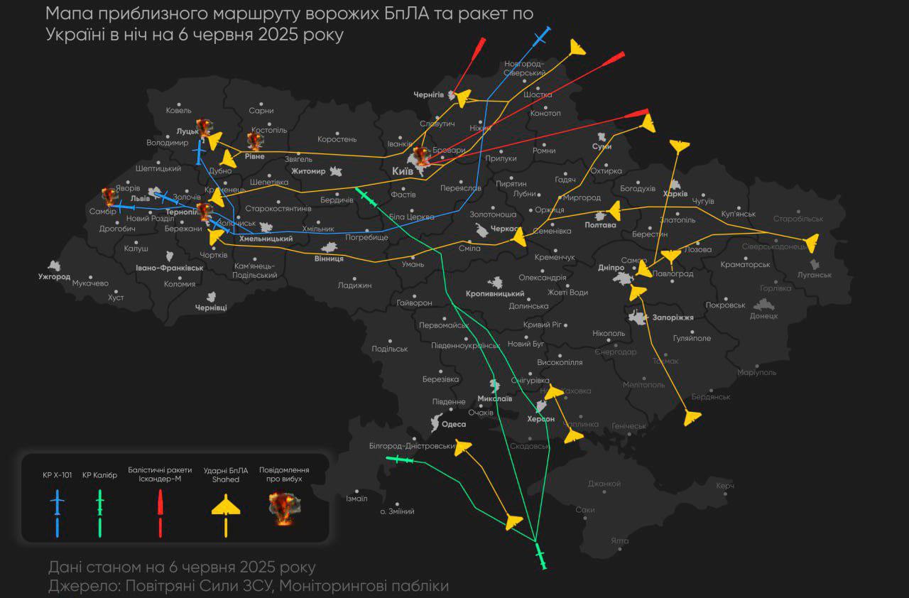 “La noche del 5 al 6 de junio de 2025, Rusia lanzó un ataque combinado en Ucrania contra las ciudades de Kiev, Ternopil, Lutsk, Chernigov y la región de Lviv”, escribía ayer en su parte de guerra Ukrainska Pravda, que aportaba los datos suministrados por Yuri Ignat según los cuales la aviación ucraniana alegaba que “Rusia desplegó 452 proyectiles aéreos, entre ellos misiles y drones. Las defensas aéreas derribaron 406 objetivos, con impactos registrados en trece localizaciones y daños causados por la caída de metralla”. Como es habitual, la elevada tasa de interceptaciones alegadas por la aviación ucraniana choca tanto con las imágenes que se publicaron a lo largo del día como con las plegarias de una Ucrania supuestamente a merced de los misiles rusos y extremadamente necesitada de nuevos sistemas de defensa aérea.